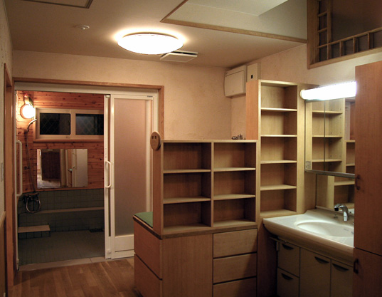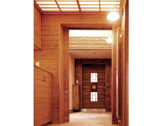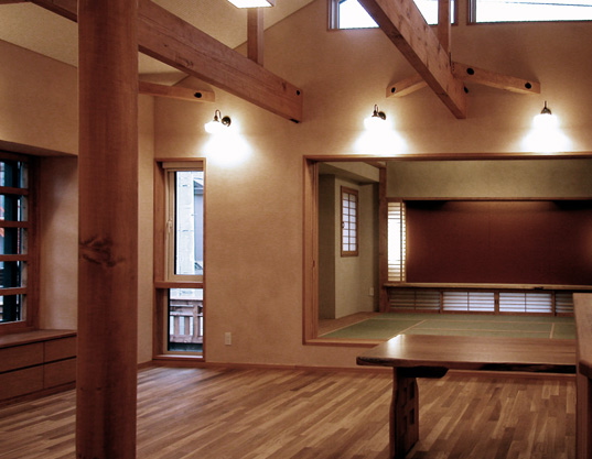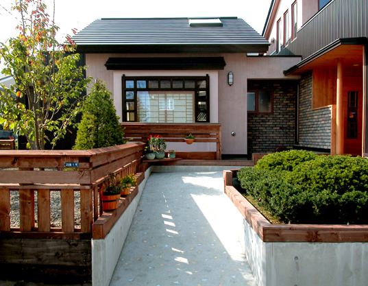 道路から玄関はスロープとし、室内は居間とタタミ室の間は使いよさの為に段差をつけて、 他はすべて平らな床面のつくりです。 (2006年完成)