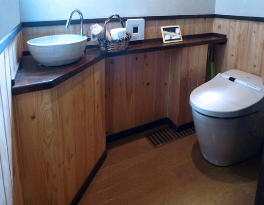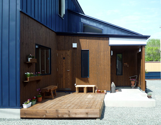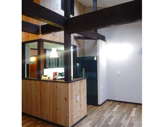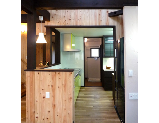 築35年(既存)の建て替え住宅です。 まちなか・・・・に建つ南東側道路の2階建て家族3人の個室を1・2階に配置し、2階とのつながりを重視した間取りです。全体の中心にキッチンスペースをとって、まわれる動線にし、使いやすい水廻りになりました。 (2010年完成)