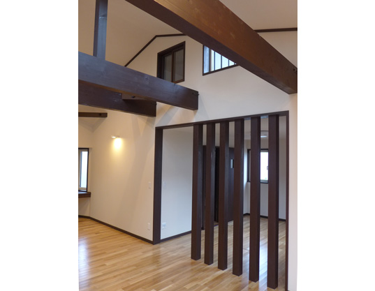 北西角地で交通量の多い北道路側の窓を小さくして遮音を考え、 そして南側を大きく開き、トップライトや東西に高窓をとり採光のいきどとく工夫をしました。