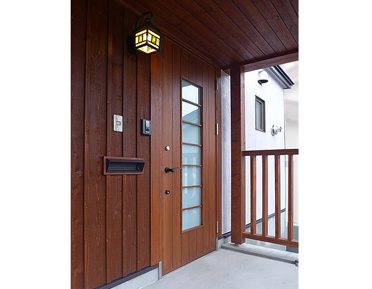 廊下のたて格子は水まわり(トイレ、洗面、洗濯、浴室)への配慮(音、目線)を兼ねた楽しげで軽快な雰囲気を演出します。