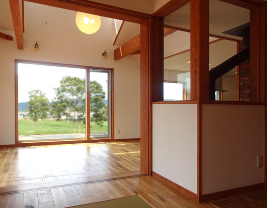 リビングには薪ストーブがあって、子どもが昼寝できるタタミ室につながり、